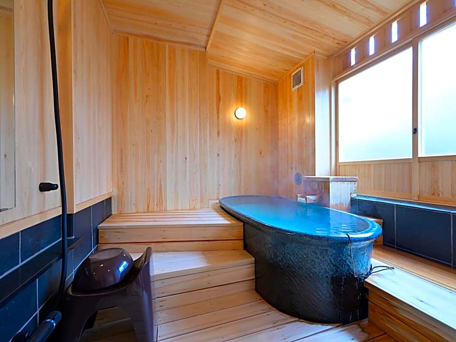 The spacious family room features air conditioning, tatami, as well as a private bathroom boasting a bath and a shower. The unit has 2 beds and 3 futons.