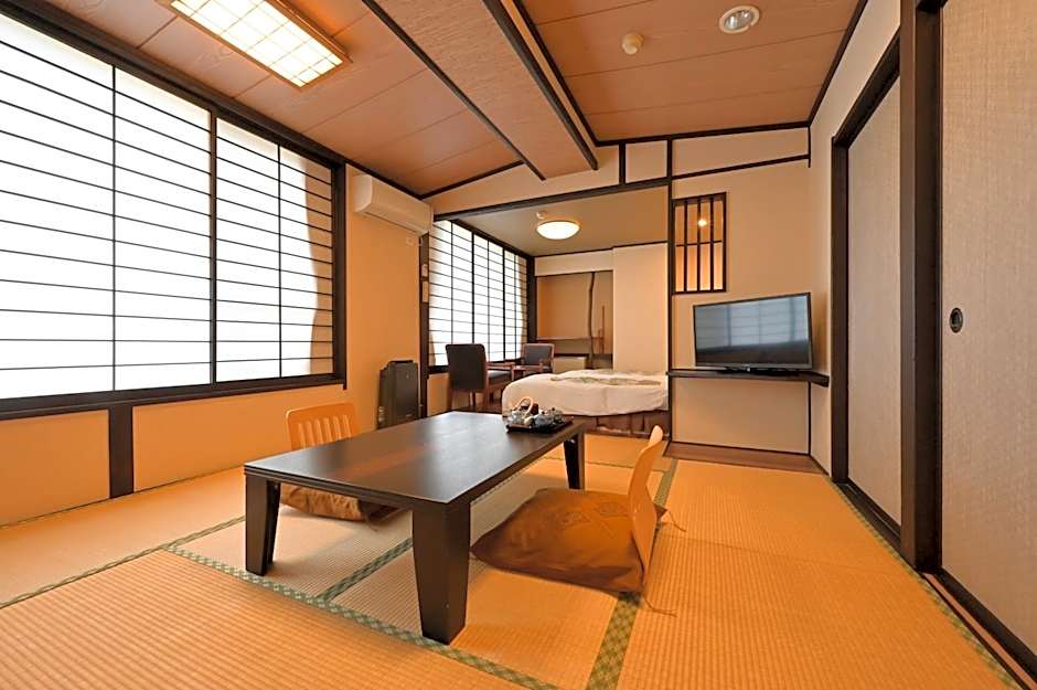 The quadruple room provides air conditioning and tatami, as well as a shared bathroom featuring slippers. This quadruple room features yukata, heating and a TV. The unit offers 4 futons.